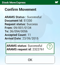 Sheep movements can be forwarded to the relevant statutory database. In England this is ARAMS, in Scotland it is ScotEID and in Wales it is EIDCymru. To enable this, you must first configure the relevant forwarding details for ARAMS, EIDCymru or ScotEID. To forward a request you then just record and send the request to NLMD-LT as normal. When the request is successfully sent, a message similar to this will appear: