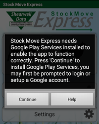Stock Move Express needs Google Play Services installed to enable the app to function correctly. If you get an error message on the Stock Move Express main screen indicating that it is not installed: