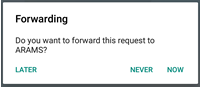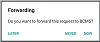 'Now' will trigger the request to be sent to BCMS immediately. 'Later' will not send the request to BCMS, you can trigger it to be sent via the website or by finding the request in the 'Alerts' tab and pressing the 'Forward to BCMS' button.'Never' will not send the request to BCMS, the data recorded will still appear in your herd register.If this message doesn't appear, the request has not been forwarded to BCMS. This could be because you haven't setup BCMS for the particular holding involved or NLMD-LT found errors with the request.