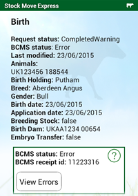 The result notification contains the BCMS Receipt ID and BCMS status, if the BCMS status is success and there is a receipt ID it means the request was successfully sent to BCMS. If BCMS reported error, press the 'View Warning/Error' button to see details of the errors reported. To resolve any errors you will need to login to the NLMD-LT website and select Manage Holdings > BCMS > Send / Review Result, for details see the sending to BCMS guide.